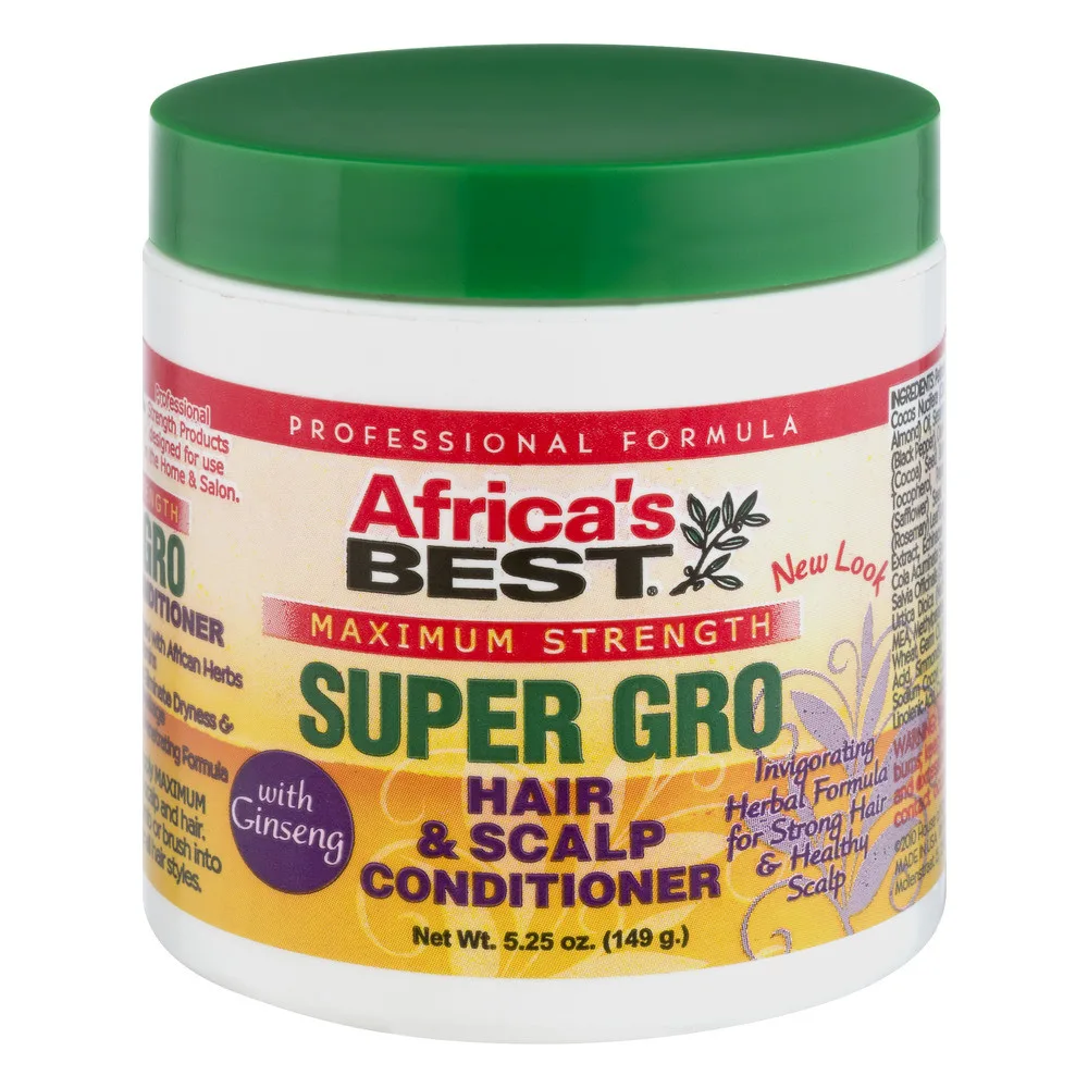 The Africa’s Best Maximum Strength Super Gro includes all of the healthy benefits of our deep-penetrating Super Gro’s Coconut Oil with the addition of Olive Oil for shine, and Ginseng for increased circulation to scalp, promoting healthy hair growth. Equipped with all the essential oils your hair craves, this invigorating pomade is specially formulated to penetrate your scalp and eliminate dryness, while stopping breakage in its tracks. Infused with Coconut Oil, a special blend of African extracts, along with Olive Oil and Ginseng, this extra strength formula enhances your tresses and leaves your hair feeling smoother and healthier. Daily use is recommended.