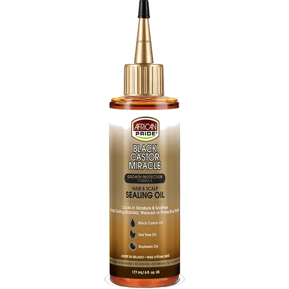 This African Pride Black Castor Miracle Sealing Oil is specially crafted with a blend of Black Castor Oil, Tea Tree Oil and Soybean Oil to lock moisture into hair strands and improve moisture retention. Helps to condition hair, soothe scalp, calm itching and prevent dryness. Great for braids, crochets, edges, under weave care and protective styles. Black Castor Oil: Nourishes scalp & helps to promote hair growth Tea Tree Oil: Helps to treat, protect and condition scalp. Soybean Oil: Improves moisture retention and shine.