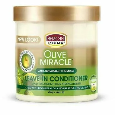 African Pride Olive Miracle Leave-in-conditioner helps protect hair from damage while strengthening hair deep inside for a stronger healthier look. Enriched with Olive Oil: seals in moisture, helps prevent breakage; Tea Tree Oil: helps protect and condition scalp and hair. Free of harmful components, including parabens, mineral oil, sulfates, & petrolatum. High quality & safe to use.