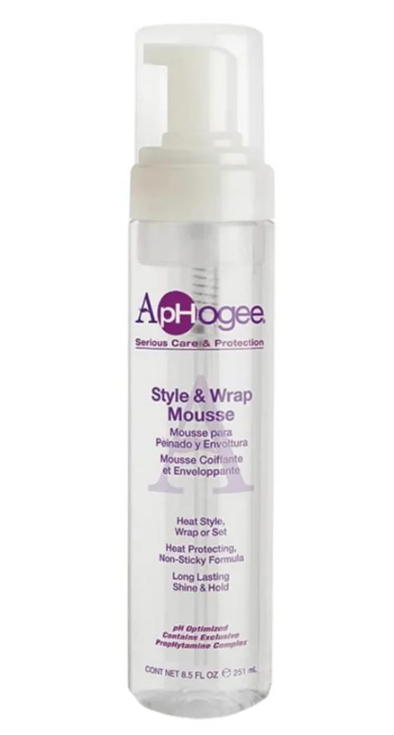 Style & Wrap Mousse This easy to apply foam adds incredible shine and body when used for heat styling, wrapping or setting your hair. Non-sticky, no flake formula provides extra long lasting hold and ApHogee Pro-Phytamine complex provides protection against heat and hair breakage. Alcohol free formula.