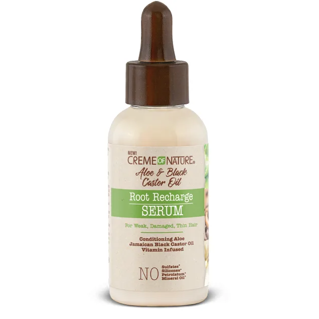 Creme of Nature® Aloe & Black Castor Oil Root Recharge Serum is infused with a blend of Aloe Vera gel, Jamaican Black Castor Oil and Vitamins. This collection targets weak, damaged hair to provide a healthy level of strength and noticeable length. Protects Against Damage when Styling Instantly Hydrates Hair & Dry Scalp