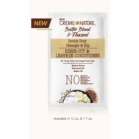 Creme of Nature's Butter Blend & Flaxseed 3-In-1 Rinse Out & Leave-In Conditioner Pkts detangles, hydrates, strengthens, and increases hair elasticity with Double Duty Rinse-Out & Leave-In Conditioner infused with a Butter Blend, Flaxseed Oil & Argan Oil. This lightweight multi-usage formula is perfect as a rinse-out and leave-In. Detangles & Adds Great Slip Helps Stretch Hair & Increases Elasticity Hydrates & Adds Manageability Softens & Adds Shine Strengthens & Helps Prevent Damage