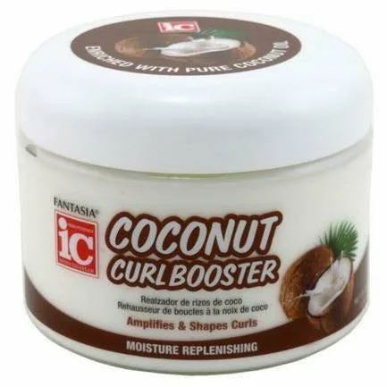 Fantasia IC Coconut Curl Booster A flexible, styling product made with pure coconut oil for maximum hydration and nourishment! Stops frizzy, unruly, shapeless curls and lifeless coils! Define, amplify, elongate and control curls, coils and braid-outs, while adding shine and natural conditioning. Can be used on dry hair to re-moisturize curls. No buildup, No flakes and No stiff, dry feeling... JUST LOTS OF LUSCIUOS LOCKS