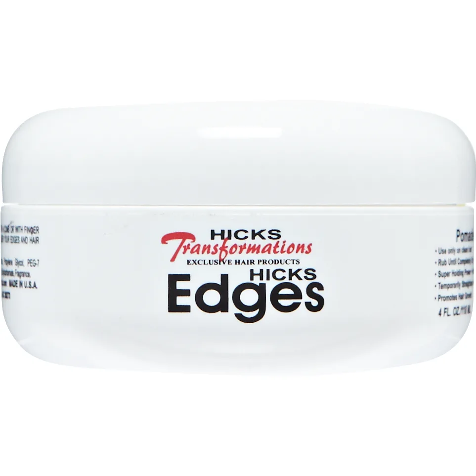 Hicks Total Transformations Hicks Edges holds hair firmly in place with a super shine and without flakiness. Leaves edges looking and feeling shinier and healthier than before. This genuine hair pomade is non-flaky and non-sticky and rinses out easily. Pomade Super holding power No flaking Temporarily straightens your hair Promotes hair growth