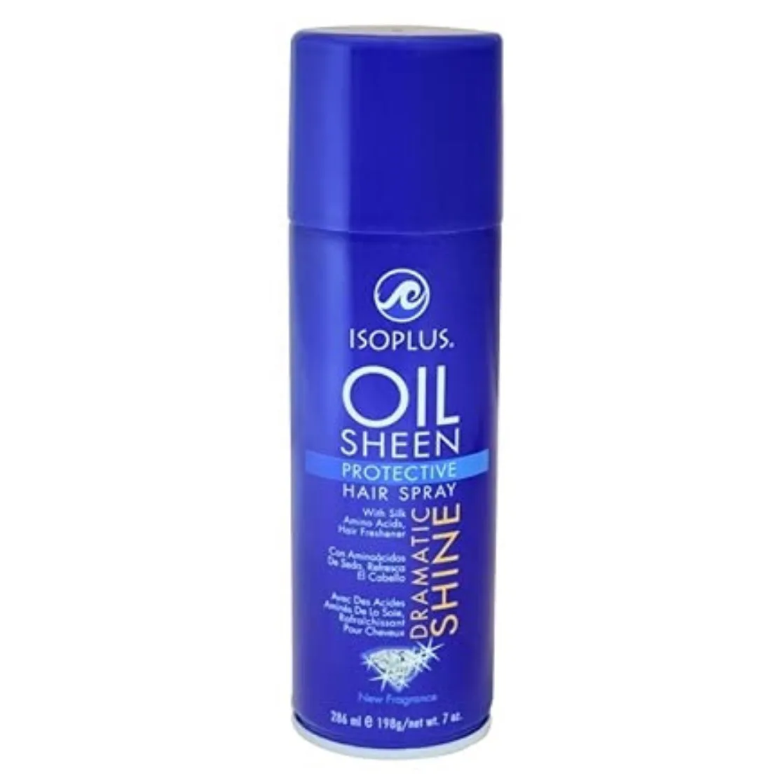 Isoplus Oil Sheen Hair Spray is a concentrated oil sheen formula quickly adds sparkle, sheen and life. This hair spray is excellent for blow drying, various waves, curls and wigs. Adds not only shine to your hair, but body and volume too. Isoplus Oil Sheen Hair Spray is formulated with essential vitamins that promote healthy, growing hair that shows results. Improves manageability and feel Faster growth through vitamins A hair doctor in a can No CFCs 7/9oz.