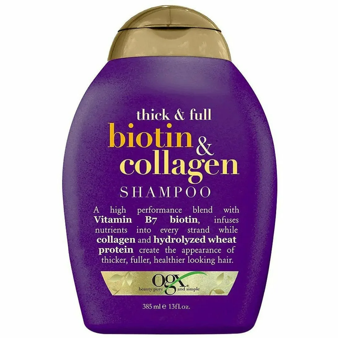 OGX Thick & Full Biotin & Collagen Shampoo is a high performance blend of powerful ProVitamin B7 biotin infuses nutrients into every strand, while plumping collagen adds volume and dimension, and hydrolyzed wheat proteins strengthen, for thicker, fuller, healthier looking hair. For Thicker, Fuller Healthier Looking Hair Adds Volume & Dimension Helps Any Hair Type Paraben Free, Sulfate Free