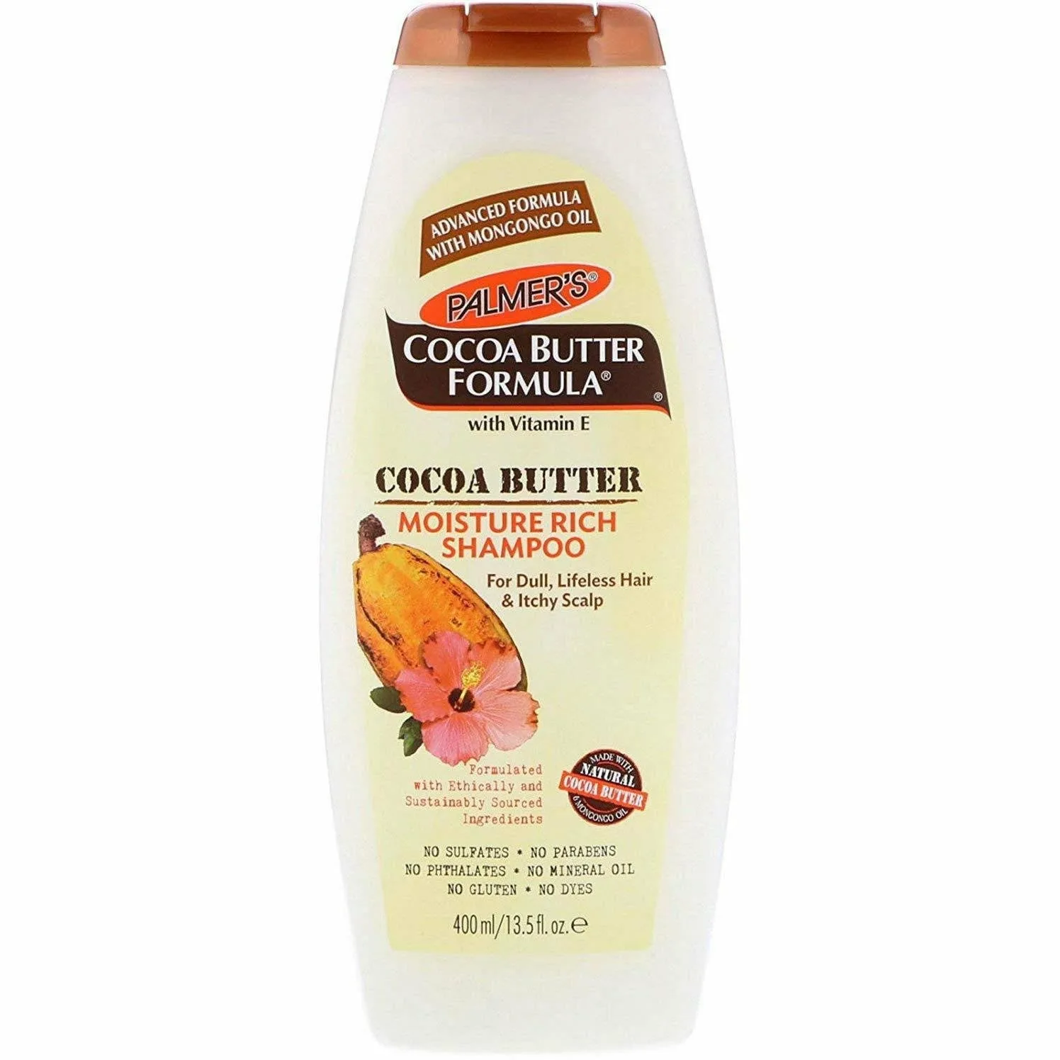 Palmer's Cocoa Butter Formula Moisture Rich Shampoo For dull, lifeless, and itchy scalp advanced formula with mongongo oil formulated with ethically and sustainably sourced ingredients no sulfates, no parabens, no gluten, no dyes, no phthalates, no mineral oil