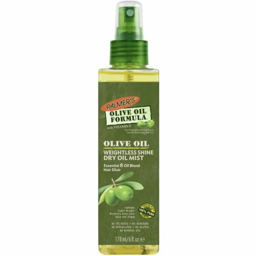 Palmer's Olive Oil Formula Weightless Dry Oil Mist imparts a sheer veil of moisture to the hair, creating a protective layer with a glossy sheen. The amla, argan, and grape seed oil blend protects hair from styling tools and tames frizz. It instantly restores moisture to dry hair with extra virgin olive oil and vitamin e. It's free of sulfates, parabens, and phthalates. Weightless oil imparts sheer veil of moisture creating a protective layer and glossy sheen Amla, Argan and Grape Seed Oil blend protects hair from styling tools and tames frizz Instantly restores moisture to dry hair Free of sulfates, parabens, phthalates, mineral oil and gluten