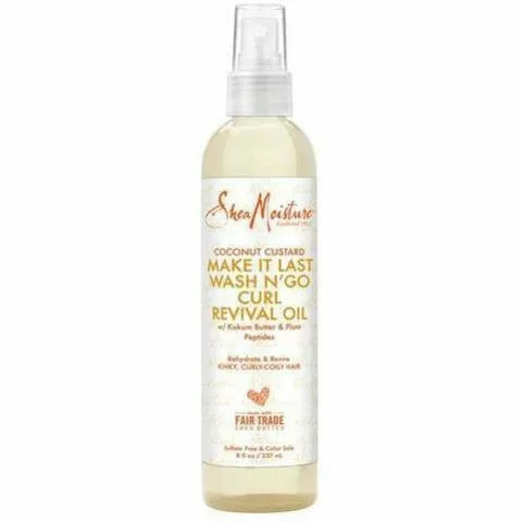 Shea Moisture Coconut Custard Make It Last Wash N' Go Curl Revival Oil Trying to get one more day out of your Wash N' Go? Instantly reviving wilting curls with this nutrient-rich oil spray. Formulated with a rich blend of Coconut Oil, Kokum Butter, and Plant Peptides Hydrating formula that helps wake up your curl definition.