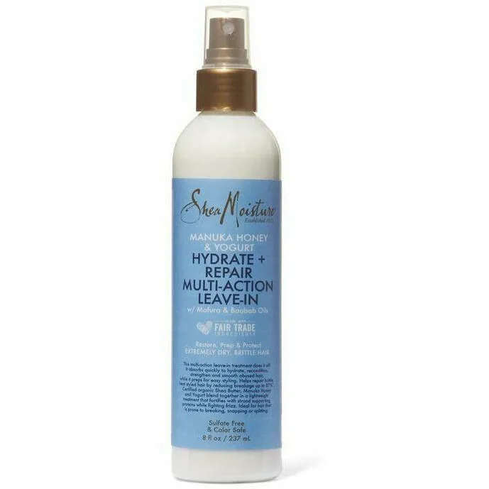 Shea Moisture's Manuka Honey & Yogurt Hydrate + Repair Multi-Action Leave-In does it all! It absorbs quickly to hydrate, recondition, strengthen and smooth abused hair, as well as preps for easy styling. Protects brittle hair from high heat up to 450 degrees, while reducing breakage up to 87%*. Certified organic Shea Butter, reparative Manuka Honey and yogurt blend together in a lightweight treatment that fortifies hair with strand supporting proteins while fighting frizz. Ideal for hair that is prone to breaking, snapping or splitting. Manuka Honey-This formula with Manuka Honey helps provide moisture and boost shine. Yogurt Extract-This formula with Yogurt Extract adds nourishing moisture to your hair. Mafura Oil-This damage control formula with natural Mafura Oil softens and promotes healthy-looking hair