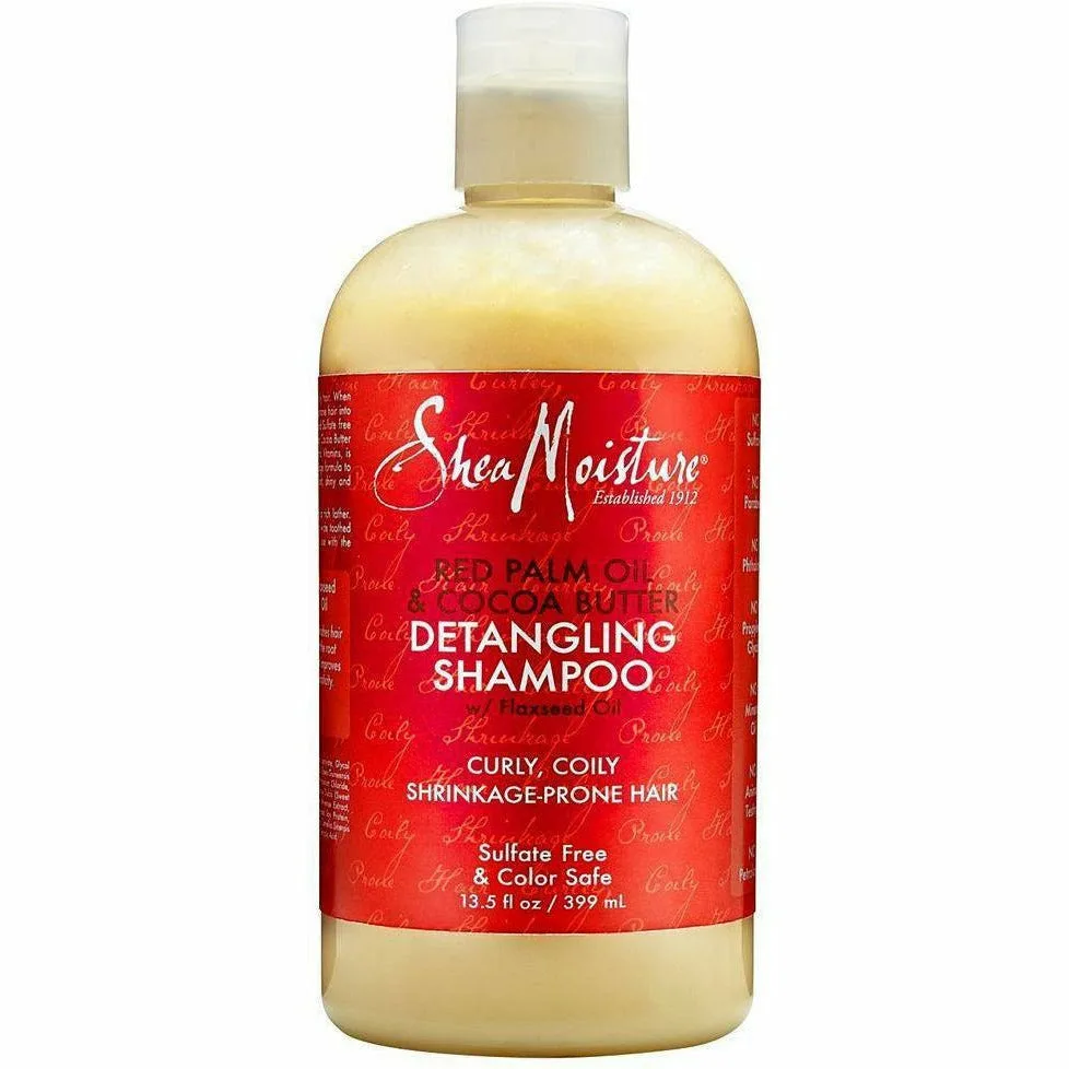Shea Moisture Red Palm Oil & Cocoa Butter Detangling Shampoo s hows length and transforms shrinkage-prone hair into luxurious, elongated locks use this coconut oil and sulfate free shampoo that cleanses and detangles. Moisturizing Cocoa Butter infused with Red Palm Oil, rich in antioxidants and Vitamins, is blended with Flaxseed Oil to create this anti-shrinkage formula to help show off hair's length while leaving locks soft, shiny and tangle free. Great for 3-4C hair types Transforms shrinkage-prone hair into luxurious Sulfate free and Coconut Oil-free Great for 3-4C hair types Cleanses and detangles Elongated locks Paraben-free, Phthalate-free, Sulfate-free