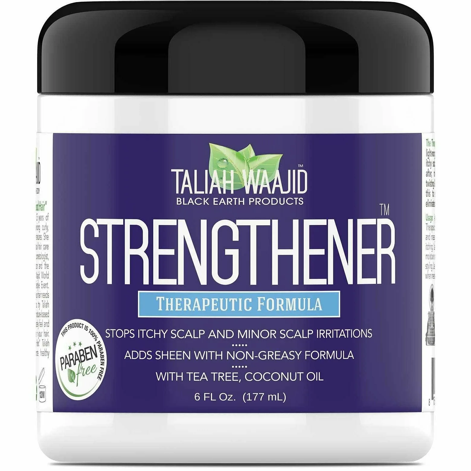 Taliah Waajid Strengthener Therapeutic Formula is a light, non-greasy, creamy hair and scalp herbal formula is perfect for use directly on the scalp to combat dryness and itching. Great for using immediately after roller set, twist, braid and loc services to give much-needed relief for the stressed scalp. Can be used after roller set, twist, braid, weave, and loc services Helps to relieve stressed, dry, itchy scalp Contains refreshing, soothing Oregano, Menthol, and Sage extracts