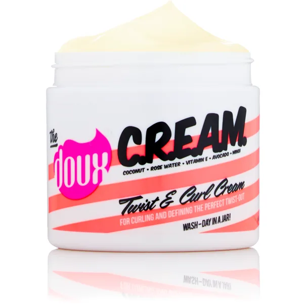 The Doux CREAM Twist & Curl Cream Defines and elongates Twist-outs and curls. Ultra moisturizing formula helps to aid in length retention by restoring moisture balance, increase elasticity, and preventing breakage. Restores moisture Prevents breakage Increases elasticity Apply to clean, wet, or dry hair Twist, finger coil, or shingle C OCONUT, R OSE WATER, VITAMIN E , A VOCADO OIL, M INOI OIL